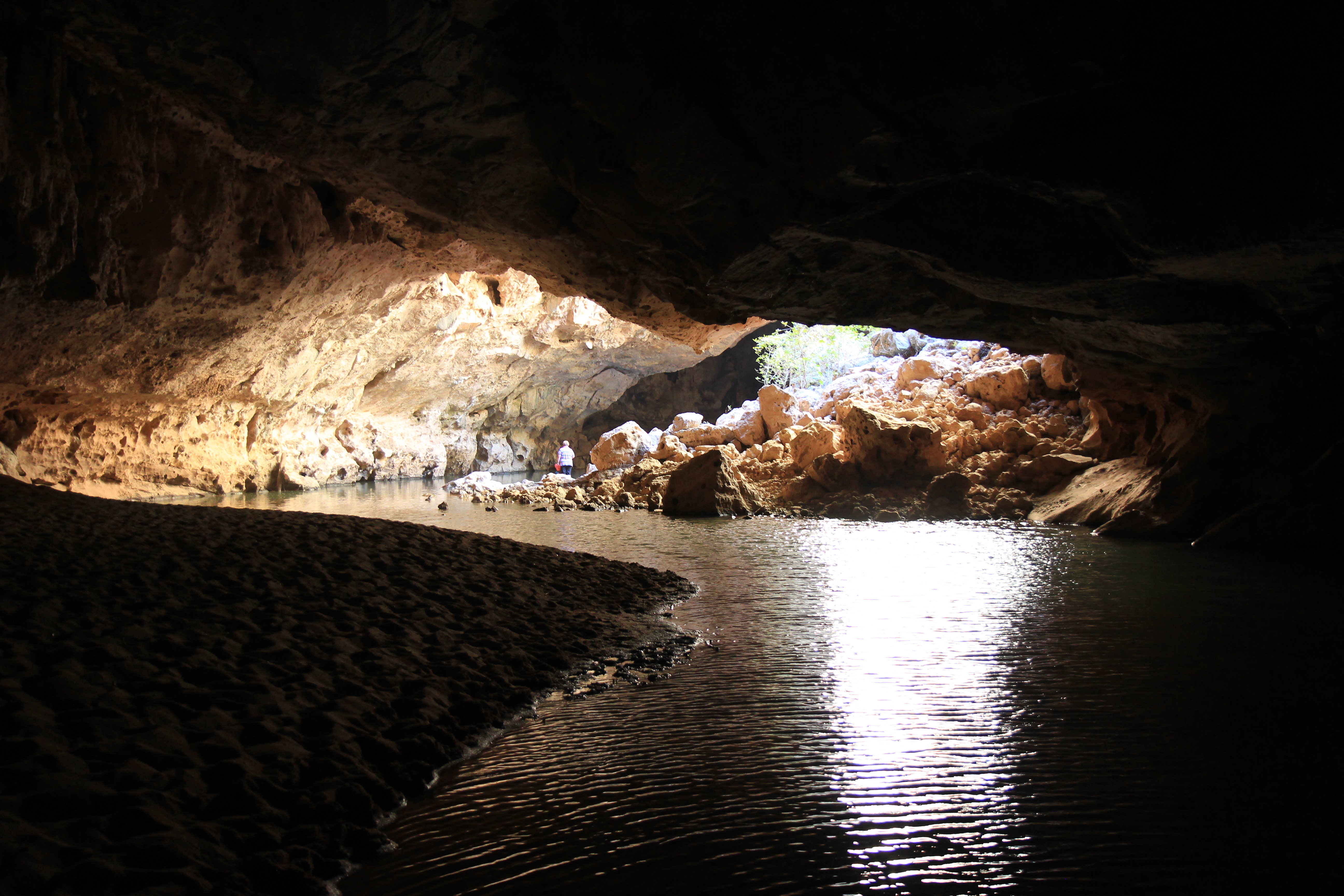 Back to the camp for lunch and then off to Tunnel Creek along probably the roughest bit of road encountered so far on this trip. Nevertheless , the drive is well worthwhile as armed with torches we are able to follow the creek as it tunnels its way through the Napier Range. This involves wading through some fairly cold water up to our thighs in complete darkness, apart from the torchlight and the Irelands have come armed with a pathetic little torch which is totally inadequate. At one stage we find ourselves in the middle of the tunnel, standing in the water with no other tourists in sight and unable to proceed as our torch does little more than shine down on our shivering knees. Eventually, some saviours arrive in the shape of better-prepared fellow tourists and we are able to get through the lengthy tunnel to the very pleasant creek at the other end. By the time we return we have memorized the wading path and emerge unscathed after a memorable experience.